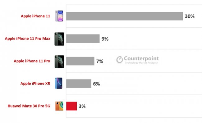 Любопытно, что в премиум-секторе четыре из пяти самых популярных смартфонов разработаны компанией Apple. Так, на первом месте находится аппарат iPhone 11. Далее следуют модели iPhone 11 Pro Max, iPhone 11 Pro и iPhone XR. Замыкает пятёрку смартфон Huawei Mate 30 Pro 5G.