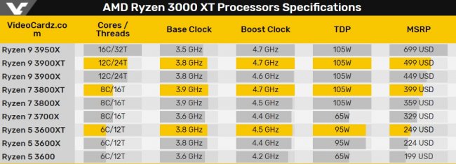 Как указывает ресурс VideoCardz, рекомендованная стоимость модели Ryzen 9 3900X после анонса XT-версии снизится до $449 (на 50 долларов), чип Ryzen 7 3800X подешевеет до $359 (минус 40 долларов). Стоимость младшего Ryzen 5 3600X снизится на $25 до отметки в $224.