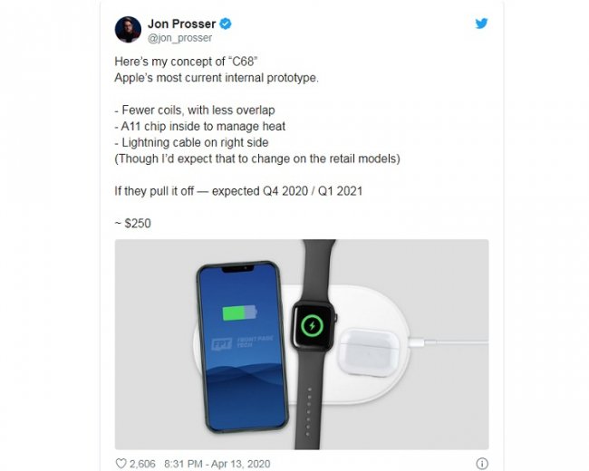 Устройство, показанное на снимке, выглядит идентично AirPower, которое Apple анонсировала в 2017 году. Его выпуск был запланирован на 2018 год, однако в 2019 был отменён. Проссер ранее заявлял, что у Apple возникло множество проблем на стадиях тестирования и подготовки зарядного устройства к запуску, однако компания, по всей видимости их преодолела.