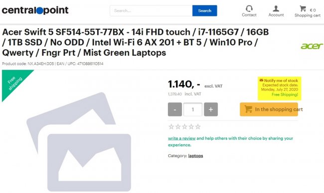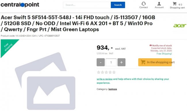 Компания Intel сейчас готовит к релизу процессоры семейства Tiger Lake для мобильных систем. Из слухов и утечек о новинках известно уже довольно много, а теперь ноутбуки на их основе случайно появились в ассортименте нидерландского магазина, благодаря чему выяснились сроки их появления в продаже и стоимость. На страницах магазина Central Point были замечены две модификации ноутбука Acer Swift 5 на новых чипах Intel. Одна из них построена на процессоре среднего уровня Core i5-1135G7, тогда как в основе другой лежит старший Core i7-1165G7. Эти чипы, по всей видимости, имеют по четыре ядра и восемь потоков, а также оснащены наиболее продвинутой встроенной графикой Intel Xe с 96 исполнительными блоками. Ноутбуки оснащены твердотельными накопителями на 512 Гбайт и 1 Тбайт соответственно. В остальном обе модификации идентичны. Стоимость более простой версии Acer Swift 5 на Core i5 поколения Tiger Lake составляет 934 евро без учёта НДС, тогда как версия на Core i7 оценена в 1140 евро. Если же добавить к этим ценникам НДС, который в Нидерландах составляет 21 %, то получится цена в 1130 и 1380 евро соответственно. Можно предположить, что в России цены будут находиться примерно на том же уровне, то есть выше 85 тыс. рублей. Для примера отметим, что сейчас Swift 5 на базе Core i5 (Ice Lake) продаётся за 75 тыс. рублей. Но наиболее интересной частью этой утечки является то, что магазин указал не только цену, но и дату поступления ноутбуков на Tiger Lake в продажу — 27 июля. Если эта информация верна, то мы можем ждать анонса новых чипов Intel уже в самое ближайшее время. Напомним, раньше уже появлялись сообщения о том, что Intel готовит анонс Tiger Lake как раз на июль этого года.