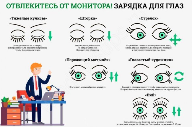 Наиболее эффективных способ защиты — проведение гимнастики для глаз. Достаточно пяти-семи упражнений, чтобы укрепить глазные мышцы и не дать им деградировать из-за длительной работы за ПК.
