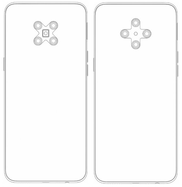 Как можно видеть на иллюстрациях, в общей сложности описываются четыре варианта исполнения тыльной камеры. В одном из них элементы заключены в блок ромбовидной формы с четырьмя угловыми и одним центральным блоком.