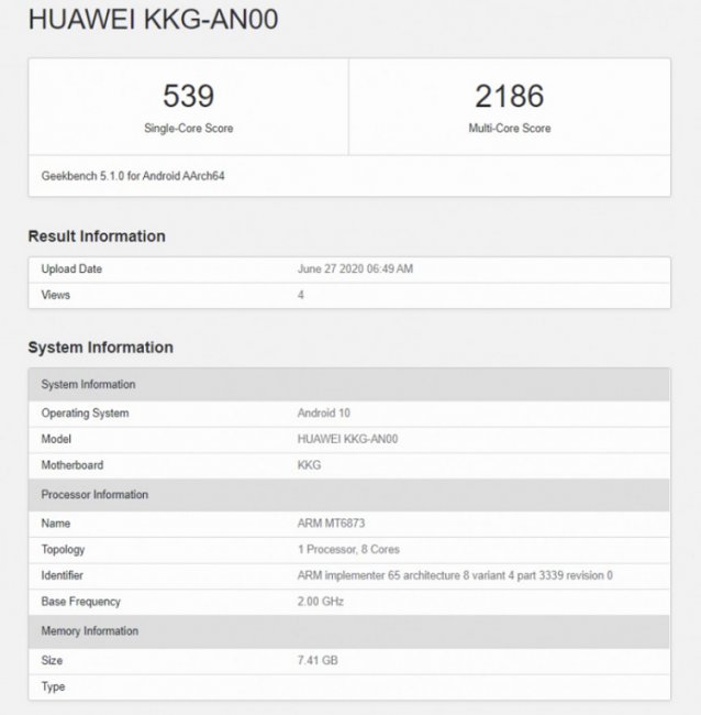 Второго июля китайский телекоммуникационный гигант Huawei представит смартфон Honor X10 Max 5G с поддержкой сотовых сетей пятого поколения. Незадолго до анонса этот производительный аппарат (кодовое обозначение KKG-AN00) показался в бенчмарке GeekBench. Популярный тест подтверждает использование в составе устройства процессора MediaTek Dimensity 800, также известного под шифром MT6873. Чип содержит восемь вычислительных ядер с тактовой частотой до 2,0 ГГц, а также 5G-модем. В GeekBench «засветилась» версия смартфона с 8 Гбайт оперативной памяти. Она показала результат в 539 баллов в одноядерном тесте и 2186 баллов в многоядерном. Известно, что новинка получит гигантский 7,09-дюймовый дисплей формата Full HD (2280 ? 1080 точек). В состав многомодульной камеры войдёт 48-мегапиксельный основной датчик. Спереди расположится 8-мегапиксельная камера. Вместимость флеш-накопителя составит 64 и 128 Гбайт. GeekBench говорит о применении операционной системы Android 10 (с фирменной надстройкой Magic UI 3.1.1). Питание обеспечит аккумуляторная батарея ёмкостью 5000 мА·ч с поддержкой быстрой 22,5-ваттной подзарядки. Размеры аппарата — 174,46 ? 84,91 ? 8,3 мм, вес — 227 г. и: