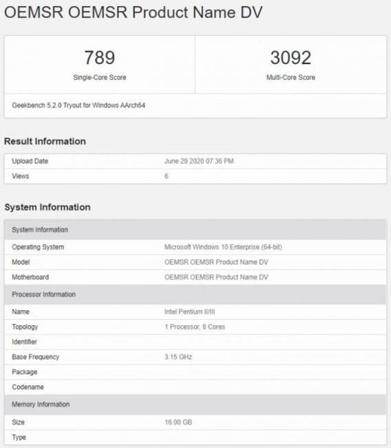 К сожалению, информация, содержащаяся в базе данных Geekbench 5, не предоставляет более подробных деталей о новом устройстве от Microsoft, но сообщает о том, что система использует 16 Гбайт оперативной памяти. Кроме того, указывается, что в однопоточном тесте устройство набрало 789 баллов, в многопоточном — 3092. К слову, схожие показатели производительности демонстрирует комплект разработчика Apple Developer Transition Kit на базе ARM-чипа Apple A12Z.