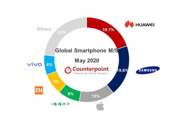Исследование, проведённое компанией Counterpoint Technology Market Research, говорит о том, что китайская компания Huawei второй месяц подряд удерживает лидерство на мировом рынке смартфонов. Компания Huawei заняла первое место на глобальном рынке «умных» сотовых аппаратов в апреле, получив долю в 21,4 %. Тогда компании удалось оттеснить на второе место южнокорейского гиганта Samsung, который показал результат в 19,1 %. В мае доля Huawei составила 19,7 %, тогда как Samsung удалось занять 19,6 % отрасли. Таким образом, разрыв между компаниями совсем невелик, но Huawei удаётся сохранять лидерство в условиях санкций со стороны Соединённых Штатов, пандемии и сложной экономической обстановки в целом. На третьем месте в рейтинге ведущих мировых поставщиков смартфонов по итогам мая оказалась Apple, удерживающая приблизительно 13 % отрасли. Далее следуют китайские OPPO, Xiaomi и Vivo: результат каждой из компаний — примерно 8 %. Все прочие поставщики сообща удерживают около 23 % мирового рынка. Отмечается также, что в мае в глобальном масштабе было реализовано 81,97 млн смартфонов. Для сравнения: в апреле отгрузки равнялись 69,37 млн штук. :