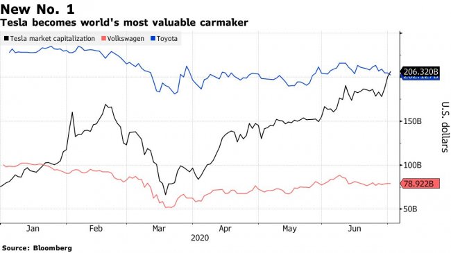 В эту среду рыночная капитализация компании Tesla впервые превысила капитализацию Toyota, тем самым сделав детище Илона Маска самым дорогим автопроизводителем в мире. Акции Tesla выросли на 5 %, достигнув нового рекордного максимума в $1135, что позволяет оценить стоимость компании в $206,5 млрд, по сравнению с аналогичным показателем Toyota примерно в $202 млрд.