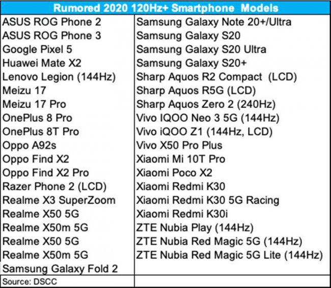 Росс Янг (Ross Young), основатель и исполнительный директор Display Supply Chain Consultants (DSCC), обнародовал перечень выпущенных и готовящихся к выпуску смартфонов, оснащённых экраном с высокой частотой обновления.