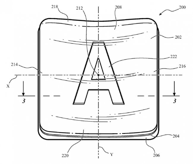 Использование стеклянные клавиш вместо пластиковых позволит дольше сохранять их презентабельный внешний вид, считает компания. Буквы, нанесённые на клавиши сверху, со временем стираются. Новый подход Apple позволит этого избежать. В документе содержится схематичное изображение клавиши, на которой литера «А» нанесена на внутреннюю часть клавиши, а не на внешнюю, как сейчас.