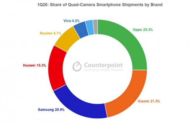 Наиболее активно данное аппаратное решение продвигает китайская OPPO: эта компания по итогам первой четверти 2020-го заняла 25,3 % сегмента аппаратов с четверной камерой.