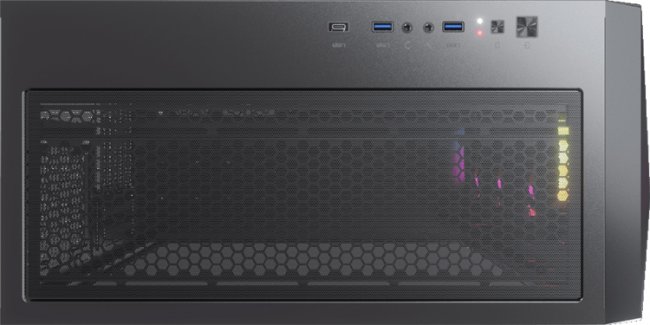 Слоты расширения реализованы по схеме «7+2»: это означает, что графический ускоритель может быть размещён вертикально. На верхнюю панель выведены два порта USB 3.0, симметричный разъём USB Type-C, гнёзда для наушников и микрофона.