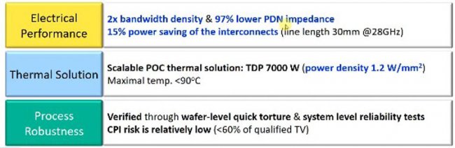 В методе InFO SoW сама пластина с не разрезанными процессорами служит подложкой и «печатной платой». В процессе упаковки поверх кристаллов устанавливаются модули питания и внешние интерфейсы. Модули питания через толстые сквозные отверстия соединены шиной с элементом охлаждения, который также отводит тепло от кристаллов-процессоров. В рамках 16-нм техпроцесса пластина-процессор Cerebras требует отвода 7 кВт мощности в виде тепла. Предложенная TSMC упаковка вместе с жидкостной системой охлаждения с этим прекрасно справляются.