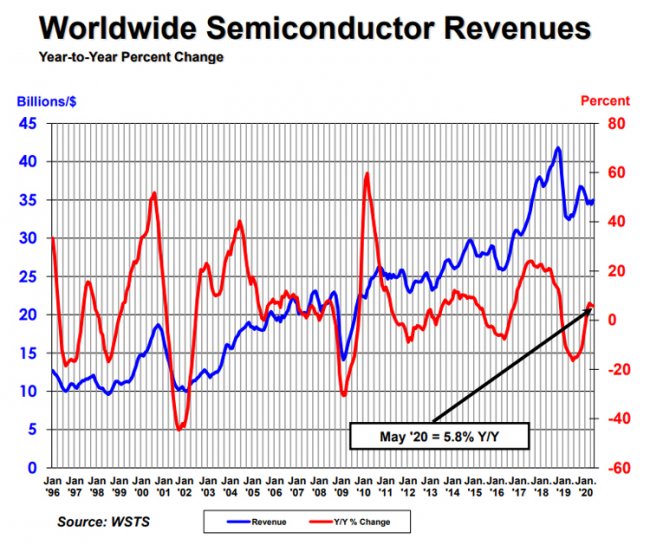 Сообщается, что в мае 2020 года в глобальном масштабе было реализовано полупроводниковых изделий на сумму в $34,97 млрд. Это на 1,5 % больше по сравнению с апрельским результатом, когда отгрузки в денежном выражении равнялись $34,43 млрд. В годовом исчислении зафиксирован 5,8-процентный рост: в мае 2019-го объём отрасли составлял $33,04 млрд.