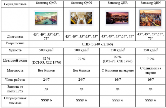 Samsung предлагает большой ассортимент дисплеев SMART Signage диагональю от 43 до 75 дюймов. Во всех случаях разрешение составляет 3840 ? 2160 точек, что соответствует стандарту 4K UHD. Доступны модели с яркостью до 350 и 500 кд/м2 и с покрытием цветового пространства NTSC на 72 или 92 %. Также Samsung предлагает дисплеи, рассчитанные на круглосуточное использование.