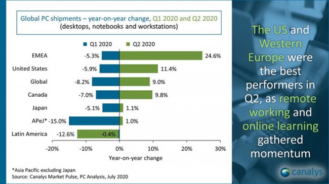 Компания Canalys обнародовала результаты исследования мирового рынка персональных компьютеров во втором квартале текущего года: в условиях распространения коронавируса и самоизоляции граждан отрасль показала существенный рост.