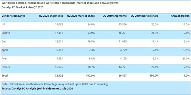 По оценкам, в период с апреля по июнь включительно в глобальном масштабе было реализовано 72,9 млн ПК. Это на 9 % больше по сравнению с результатом за вторую четверть 2019 года, когда отгрузки равнялись 66,9 млн единиц. Таким образом, рынок показал самый значительный рост за многие годы — с третьего квартала 2010-го.