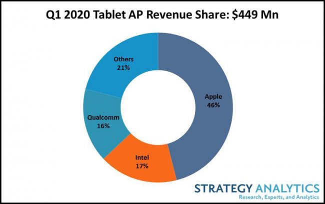 Компания Strategy Analytics подсчитала, что выручка поставщиков процессоров приложений для планшетных компьютеров в первом квартале текущего года поднялась на 2 % по сравнению с аналогичным периодом 2019-го.