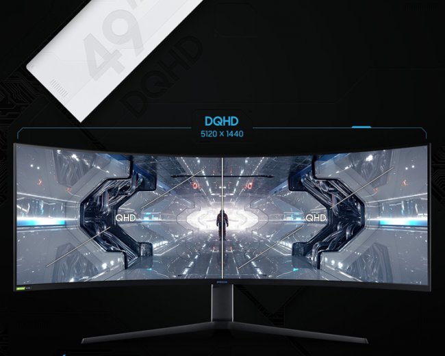Панель имеет размер 48,9 дюйма по диагонали и обладает разрешением 5120 ? 1440 пикселей (формат Dual Quad High Definition). Пиковая яркость достигает 1000 кд/м2, контрастность — 2500:1.