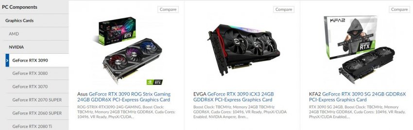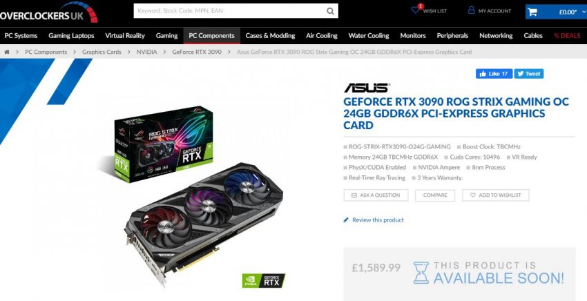 Стоимость эталонной версии флагмана серии GeForce RTX 3090 в Великобритании составляет 1399 британских фунтов (почти 138 тысяч рублей). Такой же стоимостью обладают самые дешёвые варианты в исполнении партнёров NVIDIA. А самые дорогие оцениваются в 1590 фунтов (почти 158 тысяч рублей).