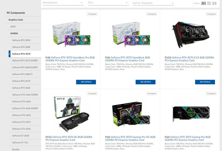 Стоимость младшей эталонной модели GeForce RTX 3070 в Великобритании составляет 469 фунтов (чуть более 46 тысяч рублей). Цена на самые доступные нестандартные варианты этой видеокарты на 20 фунтов меньше (449 фунтов или около 44 тысяч рублей). При этом цена самых дорогих моделей всего 30 фунтов выше стоимости эталонного образца и составляет 499 фунтов (чуть более 49 тысяч рублей).