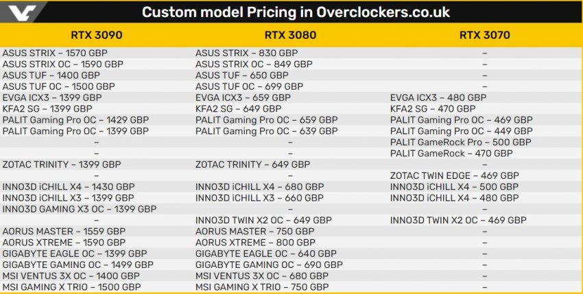 Следует учитывать, что озвученные цены актуальны только для Великобритании. Кроме того, по данным источника, они могут ещё измениться ко времени начала официальных продаж. С полным списком цен в британских фунтах на нестандартные варианты видеокарт GeForce RTX 30-й серии можно ознакомиться ниже. Цены предоставлены британским ретейлером Overclockers.uk.
