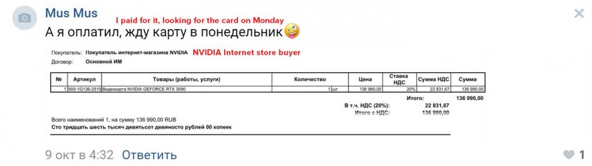 Сегодня в сообществе Reddit появился эмоциональный пост российского пользователя с ником lickneonlights, который заявил, что видеокарты GeForce RTX 3080 и RTX 3090 в исполнении Founders Edition на самом деле прибывают в Россию, но при этом до прилавков не добираются. Как описывается в сообщении, несмотря на то, что в официальном магазине NVIDIA в открытом доступе видеокарт GeForce RTX 3080 и RTX 3090 нет и не было, в социальных сетях, например в ВК, периодически всплывают фотографии свежекупленных эталонных видеокарт нового поколения. Причём некоторые изображения снабжаются подтверждением покупок карт серии Founders Edition именно в фирменном магазине.