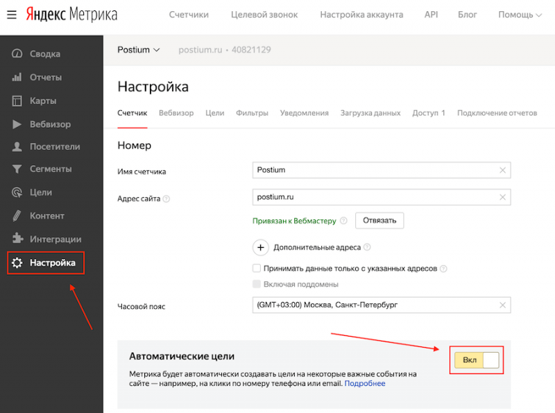 А если вы уже активно работаете с целями в Метрике, но вам хотелось бы отслеживать ещё больше важных сигналов о поведении посетителей, включите опцию «Автоматические цели» в настройках счётчика: