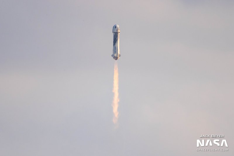 В 16:12 состоялся пуск, после чего одноступенчатая многоразовая ракета начала разгон корабля New Shepard с пассажирской капсулой. На высоте примерно 75 км капсула отделилась и продолжила движение по инерции, а ракета успешно приземлилась на специальную платформу, расположенную в нескольких километрах от места старта.