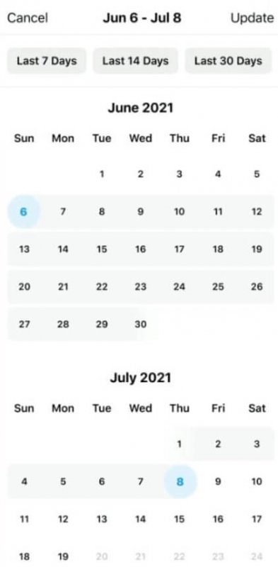Instagram добавил новый инструмент, который позволяет выбрать диапазон дат для обзора статистики. Существующие параметры по-прежнему будут доступны в верхней части экрана и вы сможете просматривать результаты своего аккаунта на основе заданных периодов времени. Плюс, здесь же вы сможете указать произвольный период времени для отображения показателей.