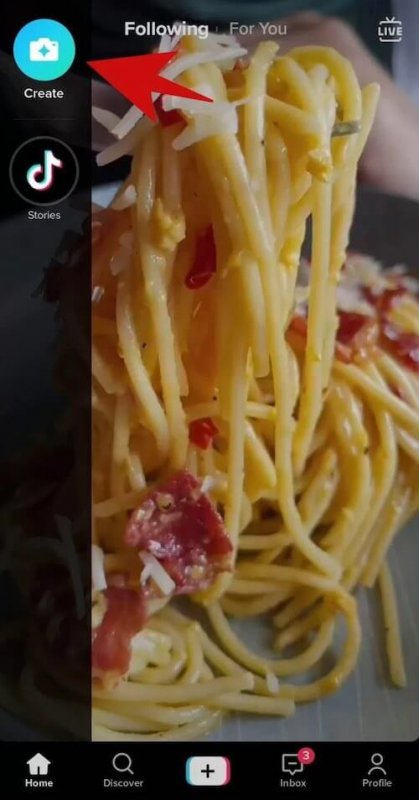Шаг 1. Чтобы добавить сторис в Тик-Ток, нажмите на значок фотоаппарата в левом верхнем углу с надписью «Создать».