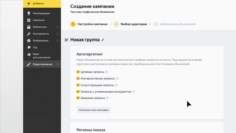 В настройках рекламных кампаний в Директе появилась возможность выбирать отдельные категории автотаргетинга — по умолчанию он включен по всем категориям. Выбрать категории для рекламы на поиске можно на уровне групп. При отборе для показа автотаргетинг и ключевые фразы будут иметь равный приоритет.