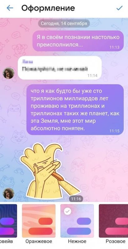 Для настройки внешнего вида беседы на нескольких пользователей доступны 11 пресетов. Обновлённый фон и цветные сообщения увидят все, кто в чате. Если изменить оформление только для своего устройства, оно будет отображаться в тех переписках, где администраторы не установили другой пресет.