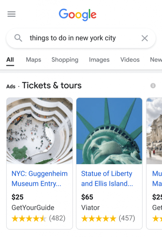 Теперь при поисковом запросе, связанном с путешествиями и отдыхом (чем заняться, куда сходить) над результатами поиска Google будет показываться блок Tickets&Tours, где и будет реклама формата Things to do.