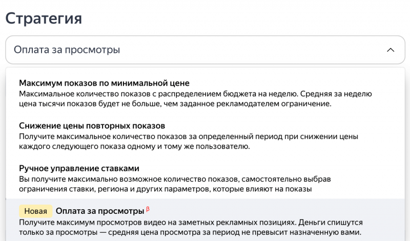 В марте Яндекс запустил тестирование стратегии «Оптимизация просмотров», которая позволяла управлять стоимостью просмотров так, чтобы средняя цена не превышала назначенную.