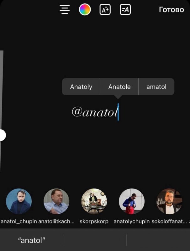 Чтобы упомянуть человека в сторис жмём соответствующую кнопку и соцсеть предлагает нам аккаунты для отметки, также их можно набрать вручную.