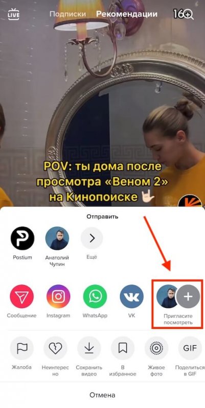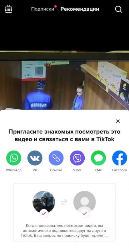 Приглашение можно отправить через WhatsApp, VK, Viber, Facebook, Telegram, по СМС или скопировав ссылку. Когда пользователь посмотрит видео, вы автоматически подпишитесь друг на друга.