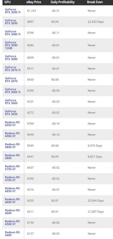 Среди 21 модели видеокарт AMD Radeon RX 6000 и NVIDIA GeForce RTX 30-й серии лишь пять из них ещё могут теоретически приносить прибыль. Например, GeForce RTX 3090, Radeon RX 6800 и RX 6800 XT, считавшиеся до The Merge наиболее прибыльными для майнинга, теперь приносят в лучшем случае прибыль в размере $0,06 в день (с вычетом затрат на электроэнергию). В этом случае потребуется более 20 лет для того, чтобы покрыть стоимость, например, Radeon RX 6800. Ниже представлена таблица с актуальными ценами на видеокарты (по данным площадки eBay) и их ежедневной прибыльностью на данный момент. В большинстве случаев она находится в минусе.