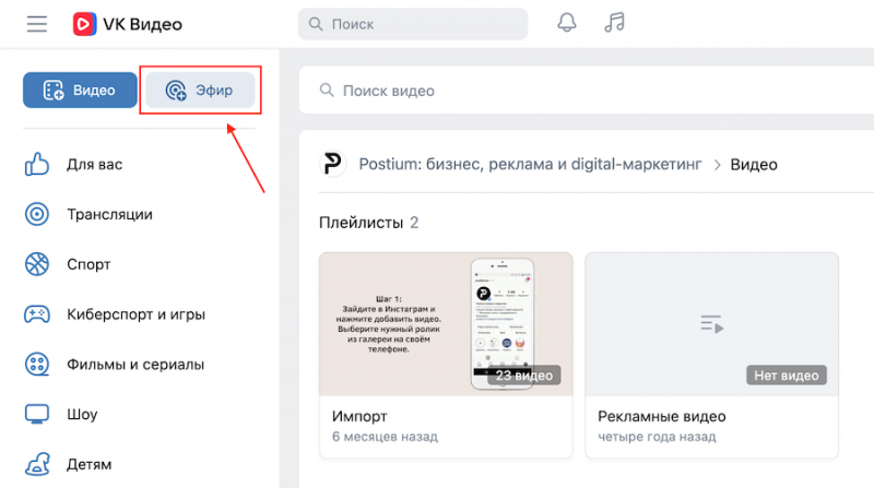 Зайдите в раздел «Видео» вашего профиля или сообщества, нажмите кнопку «Эфир».