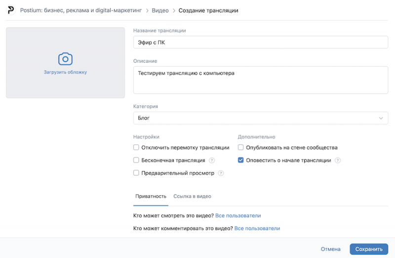 Для запуска трансляции нажмите «Сохранить». После завершения эфира, его запись появится у вас в разделе «Видео».