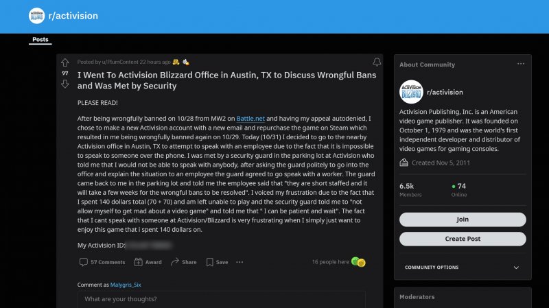 Портал PC Gamer обратил внимание на рассказ игрока PlumContent с форума Reddit о том, как он пытался обжаловать блокировку своего аккаунта в вышедшем на прошлой неделе военном шутере Call of Duty: Modern Warfare 2 от издательства Activision и разработчиков из студии Infinity Ward.
