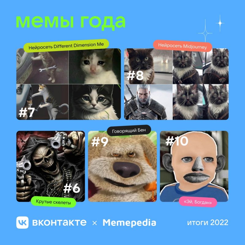 ВКонтакте совместно с онлайн-энциклопедией Memepedia представили самые популярные мемы 2022 года. За лучшие мемы пользователи голосовали в специальном мини-приложении «Годнометр».