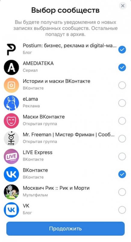 Шаг 3. Откроется список групп ВК, на которые вы подписаны — выберите те, которые хотите добавить в мессенджер.