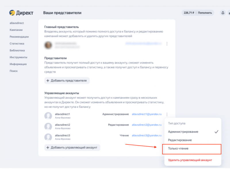 Яндекс.Директ добавил новые уровни доступа для управляющего аккаунта и представителей. Теперь можно управлять представителями или ограничивать доступ только просмотром настроек.