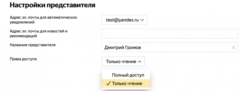 Такой же уровень доступа был добавлен представителям. Если раньше у них была возможность редактировать, изменять объявления, просматривать статистику и оплачивать кампании, то теперь для представителя можно назначить уровень доступа «Только чтение».