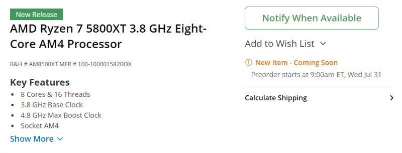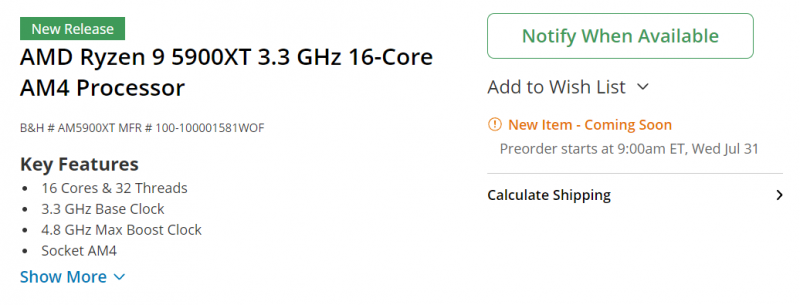 Компания AMD ранее сообщила, что появление новых моделей процессоров Ryzen 5000XT «ожидается в рознице и у системных интеграторов в июле», но точной даты старта продаж не называла. Теперь же процессоры отметились в базе данных крупного западного ретейлера B&H Photo Video. Оформлять предварительные заказы на данные чипы начнут с 31 июля.