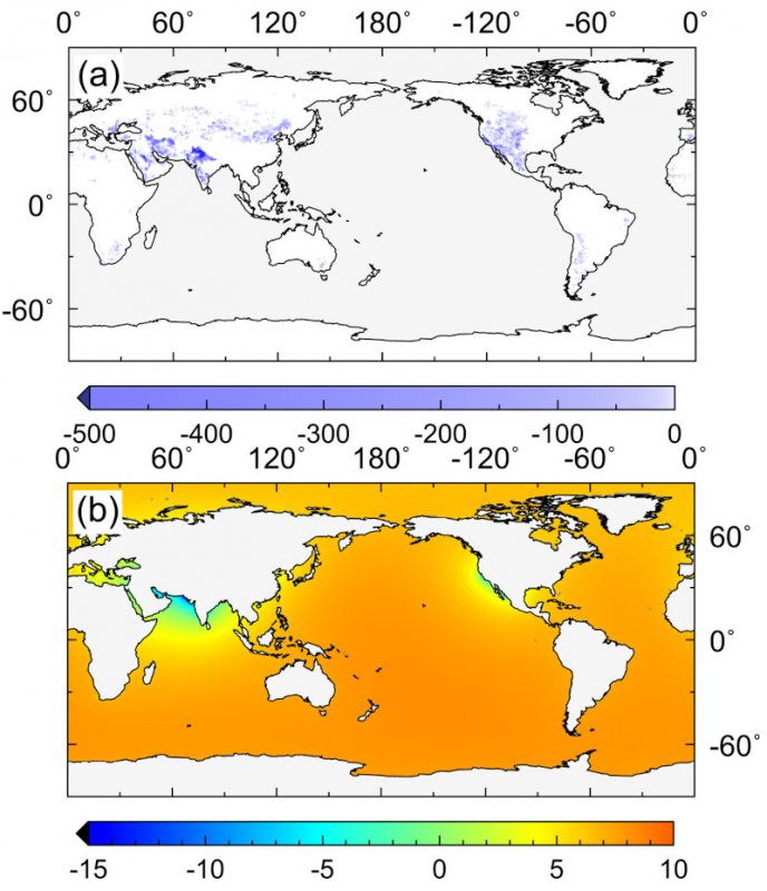 Сверху — изменение объёма подземных вод в период с 1993 по 2010 годы; Снизу — повышение уровня моря. Цветовые шкалы показывают величину изменений: от значительных потерь грунтовых вод в некоторых регионах до увеличения уровня моря в отдельных зонах. Источник изображения: agupubs.onlinelibrary.wiley.com