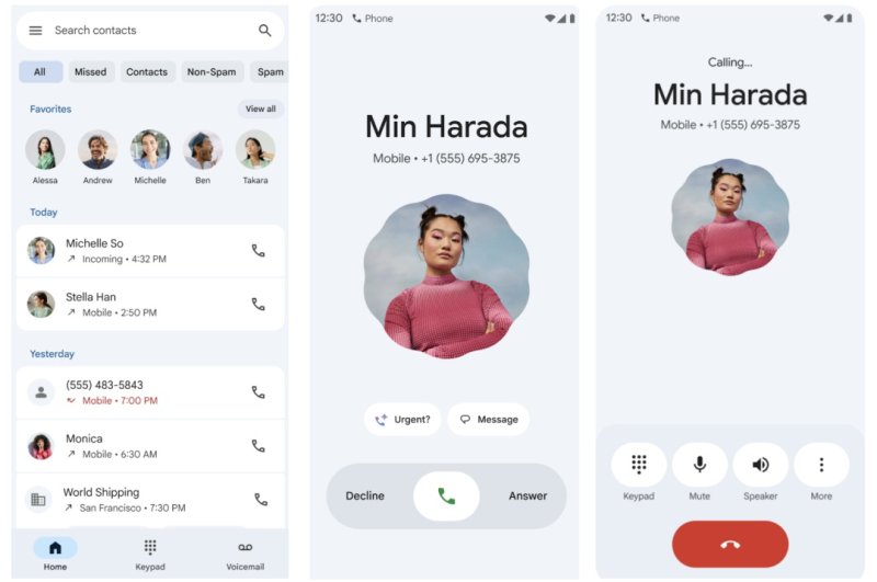 Google переработала нижнюю панель меню приложения «Телефон», заменив вкладки «Избранное», «Недавние», «Контакты» и «Голосовая почта» всего тремя вариантами: «Главная», «Клавиатура» и «Голосовая почта». «Избранное» теперь перемещено в верхнюю часть вкладки «Главная», а журнал вызовов больше не агрегирует звонки от одного и того же абонента в одну запись. Каждый входящий вызов будет показан отдельной строкой. На скриншотах также можно заметить некоторые визуальные обновления — например, граница, обрамляющая фотографию звонящего, теперь представляет собой неровный круг.