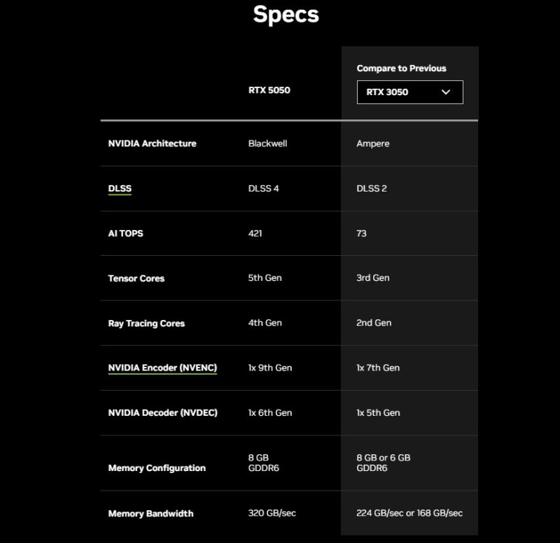 Nvidia сравнивает GeForce RTX 5050 с GeForce RTX 3050. Напомним, что десктопной версии GeForce RTX 4050 компания не выпускала, карта доступна только в мобильном исполнении для ноутбуков. Новая карта обеспечивает прирост производительности до четырёх раз благодаря поддержке технологии DLSS 4 и входящего в её состав мультикадрового генератора MFG.
