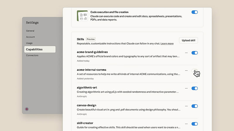 По замыслу разработчиков, функция призвана усовершенствовать агентские возможности Claude, избавляя пользователей от необходимости каждый раз составлять идеальные промпты или искать контекст для выполнения рутинных задач. Как пояснил Бред Абрамс (Brad Abrams), руководитель продукта в Anthropic, Skills призваны усилить агентские возможности Claude в контексте конкретной организации, а не для достижения абстрактных бенчмарков. По его словам, функция позволяет обучать ИИ выполнять задачи, актуальные именно для конкретной компании. В качестве примера он привёл создание презентации о рыночных результатах модели Haiku 4.5 с использованием PowerPoint Skill — Claude сгенерировал хорошо структурированные и легко читаемые слайды.