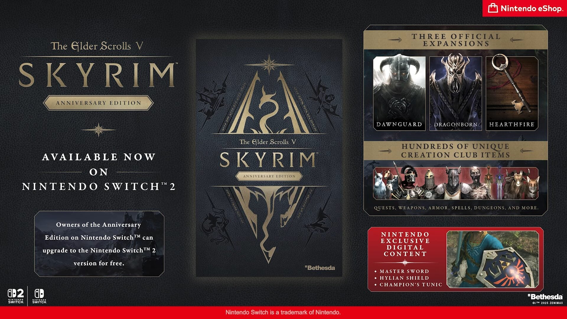 В состав The Elder Scrolls V: Skyrim для Nintendo Switch 2 входят дополнения Dawnguard, Hearthfire и Dragonborn, сотни предметов Creation Club и эксклюзивный контент — меч, щит и туника Линка из The Legend of Zelda.