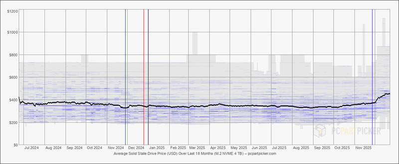 Ещё интереснее сравнение с NVMe-накопителями. Так, 4-терабайтный SSD Crucial P310 на базе PCIe Gen4 стоит около $341 (примерно 26 500 рублей), то есть лишь немного дороже внешнего USB-накопителя, но при этом обеспечивает существенно большую производительность. Как показывают графики на сайте PCPartPicker, за последние 18 месяцев цены на 4-терабайтные SATA-SSD не снижались так активно, как на NVMe и внешние SSD. Наоборот, сейчас они растут вместе с ценами на более быстрые типы хранилищ, а SATA утрачивает свою главную выгоду в виде более низкой стоимости.